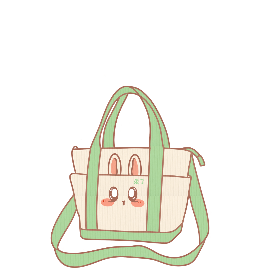 Bunny bag includes: 4 outer pockets, one large double zipper pocket, one zipper inner pocket, one extra inner pocket, corduroy style throughout, beige bag lining, corduroy crossbody strap, embroidered bunny design, embroidered bunny characters to match the bag color, and our stamp logo on the back of the bag. The designs are all premium embroidered.
